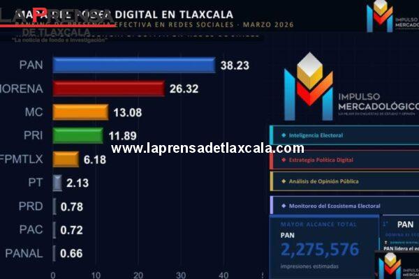 El Partido Acción Nacional (PAN) se mantiene como la principal fuerza en el ecosistema digital político de Tlaxcala, al conservar el mayor nivel de alcance y presencia en redes sociales durante marzo de 2026. De acuerdo con el análisis más reciente de la empresa Impulso Mercadológico, el PAN registra 38.23 puntos de presencia efectiva,…