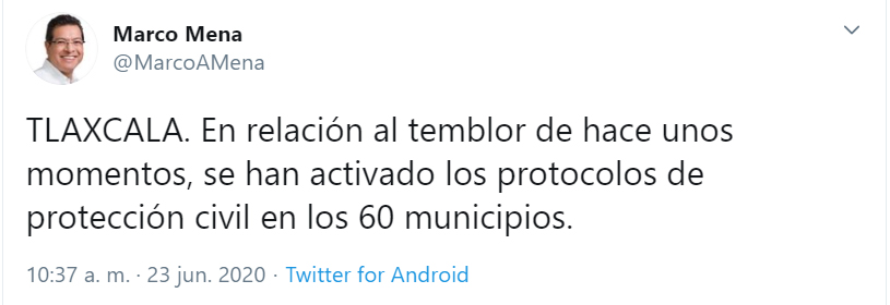 El Gobernador Marco Mena informó, a través de Twitter y Facebook, que en Tlaxcala se activaron los protocolos de protección civil: “TLAXCALA. En relación al temblor de hace unos momentos, se han activado los protocolos de protección civil en los 60 municipios”, escribió.