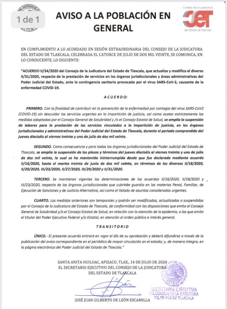Debido a que el Estado de Tlaxcala continúa dentro del semáforo rojo y con el objetivo de contribuir en las acciones de prevención de contagio del Covid-19, los integrantes del Consejo de la Judicatura determinaron ampliar el periodo de suspensión de labores para la prestación de servicios vinculados a la impartición de justicia en los órganos jurisdiccionales y administrativos del Poder Judicial del Estado de Tlaxcala hasta el próximo 31 de julio de este año.
