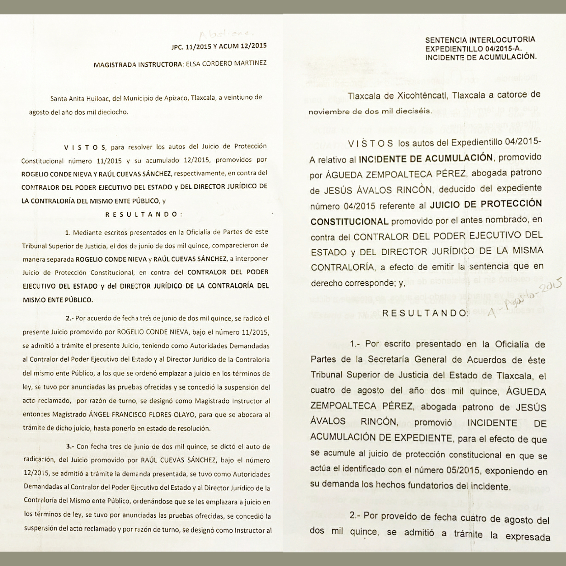 En fecha catorce de noviembre de dos mil dieciséis, se dictó sentencia interlocutoria dentro del expedientillo 04/2015-A, promovido en contra del CONTRALOR DEL PODER EJECUTIVO DEL ESTADO Y DEL DIRECTOR JURIDICO DE LA MISMA CONTRALORIA, siendo contralor en ese entonces Hugo René Temoltzin, y en dicha sentencia Rebeca Xicohténcatl Corona, “VOTO”, aun cuando había catalogado como su amigo al Ex Contralor Rene Temoltzin.