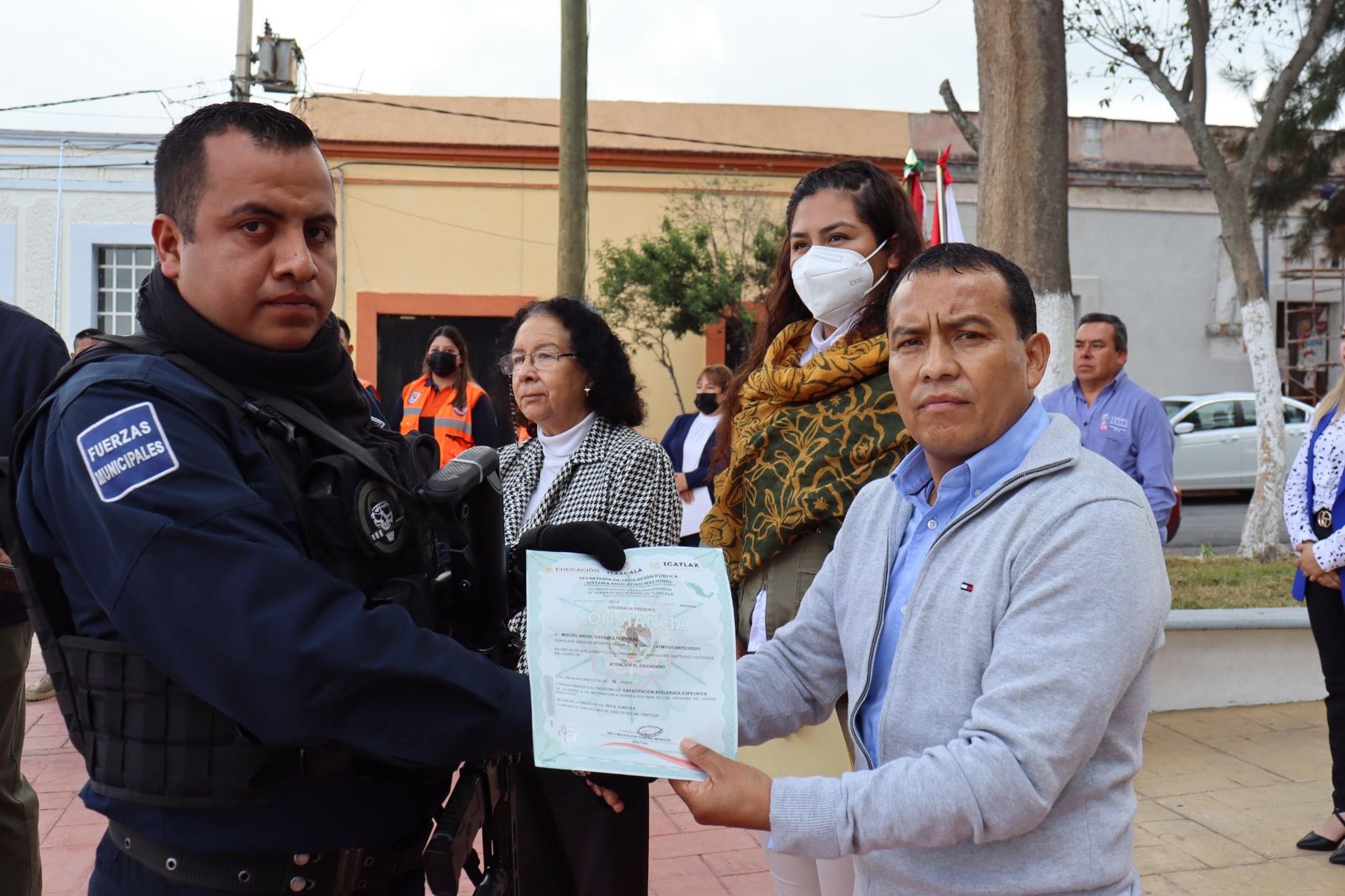 La mañana de este lunes 11 de julio, posterior al homenaje, el presidente municipal, Andrés Ramírez Galicia y Nelly Magdalena Ramírez Mendoza, Directora de la Unidad de Capacitación de Tetla, hicieron entrega de constancias a los elementos policiacos, por concluir el programa “Capacitación Acelerada Especifica”.