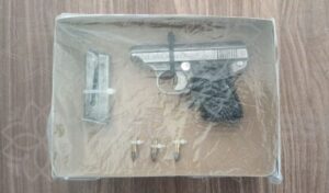 Se trata de un arma de fuego tipo escuadra, cargador y tres cartuchos.