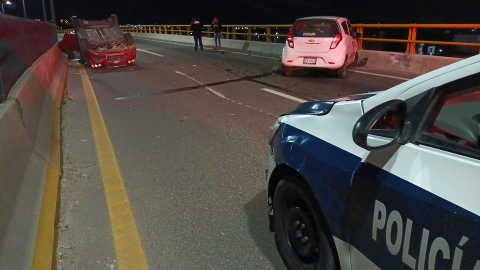 Producto del impacto en la parte trasera, el vehículo color rojo perdió el control y terminó volcado llantas arriba en la parte superior del puente, siendo que al lugar arribaron elementos de la policía municipal y paramédicos de cuerpos de emergencia, quienes tras valorar a los conductores determinaron que si bien presentaban algunas contusiones, no requieran ser trasladados a un nosocomio, por lo que ambas unidades involucradas fueron retiradas por un servicio de grúas para ser puestas a disposición de la autoridad.