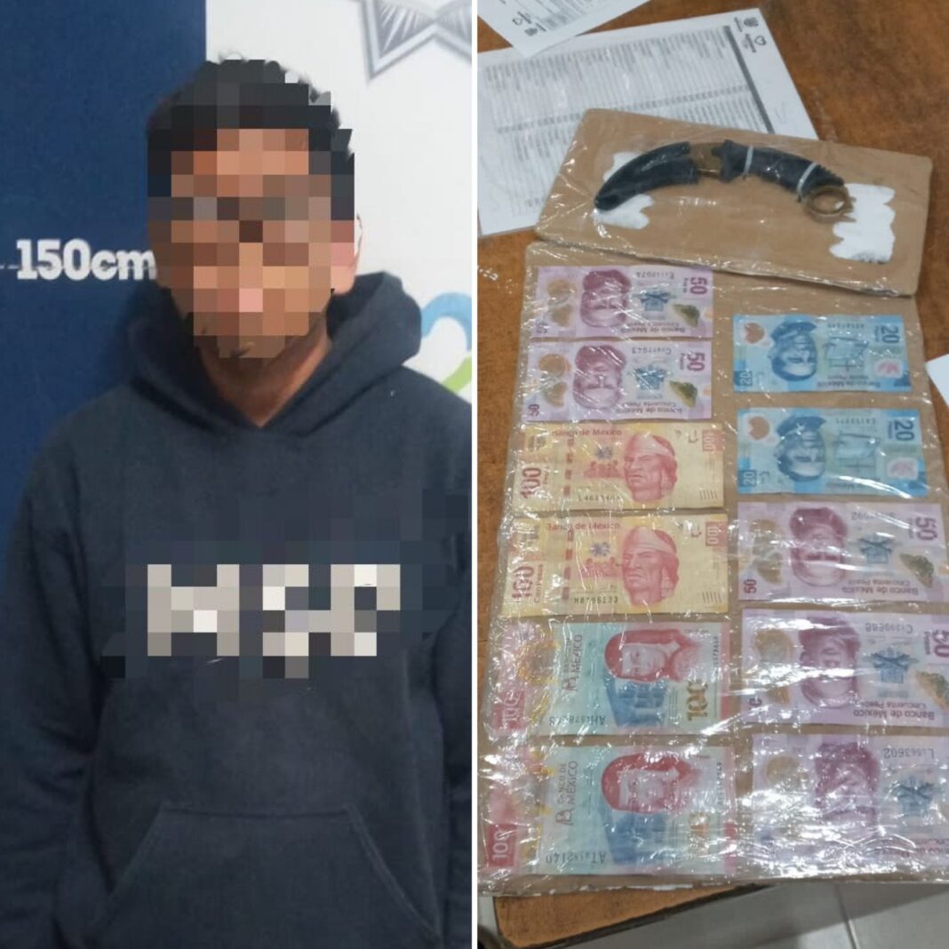 Durante recorrido de seguridad y vigilancia, la policía de Apizaco fue alertada a través de un grupo de “Blindaje Comercial” de un robo en proceso en la tienda comercial denominada “OXXO”, por lo que de inmediato se trasladaron al lugar, y al llegar, el encargado describió a un masculino que minutos antes lo amenazó con un arma y lo despojó de dinero en efectivo.