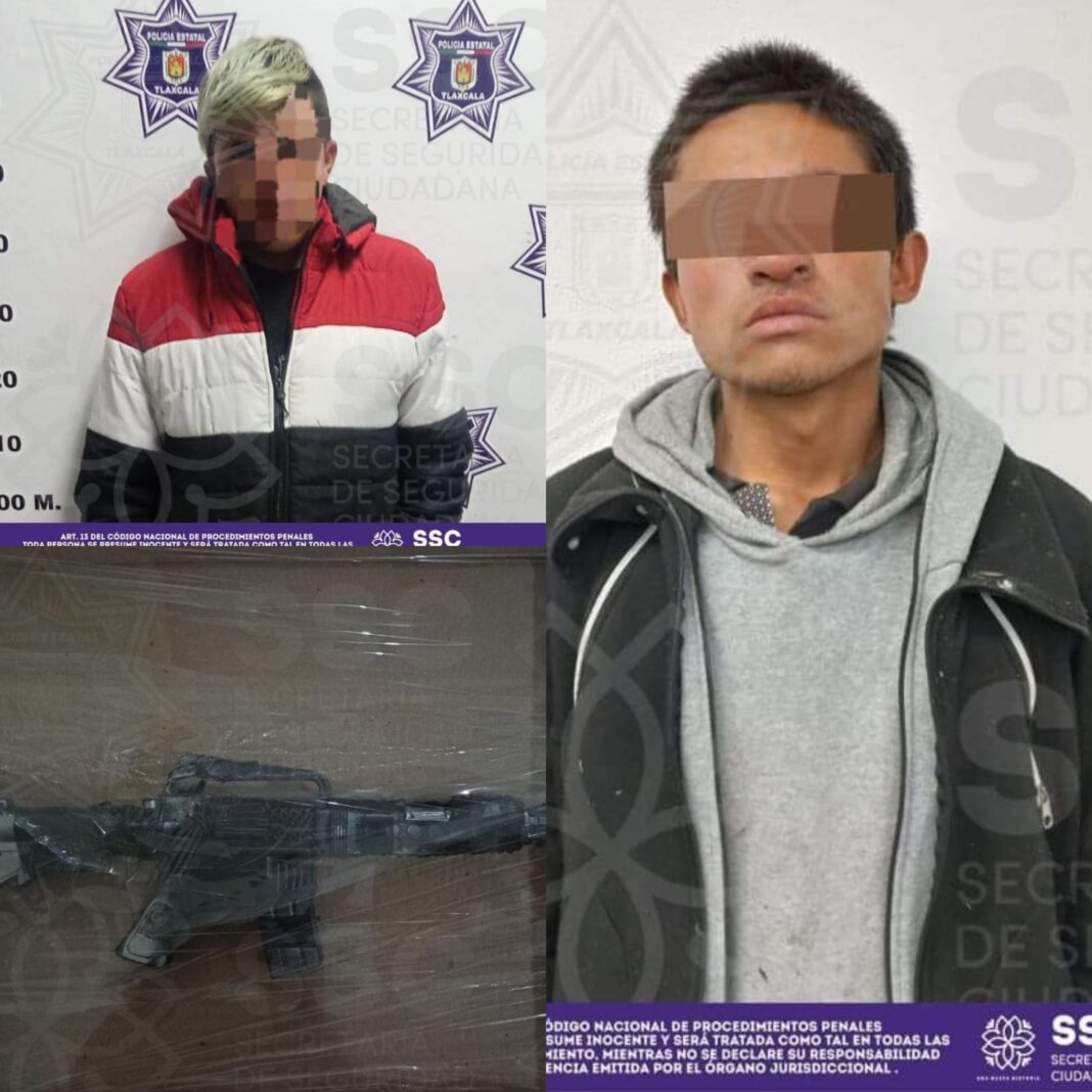 Primeramente, policías de la Dirección de Seguridad Pública, delegación Apizaco, en coordinación con la Policía Municipal de Tetla de la Solidaridad, aseguraron a Eduardo N., alias “El Gato”, de 21 años de edad, sobre la calle Libertad número 22, esquina con calle Flores, en la comunidad de Capula, por su presunta responsabilidad de los delitos de robo y posesión de objeto óptimo para agredir siendo una réplica de fuego tipo fusil AR-15.
