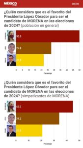Con un 34.2 % de preferencia, el secretario de gobernación Adán Augusto López se pone en segundo lugar de preferencias rumbo a las elecciones del 2024. La encuestadora “México Elige” pregunta cuál de los presidenciables consideran el favorito del presidente, posicionando a la jefa de gobierno de la Ciudad de México, Claudia Sheinbaum, con un 45 % y a Marcelo Ebrard muy por debajo, con poco más del 20 %. Esta tendencia situaría a Adán Augusto López en una consideración muy valiosa en torno a las preferencias electorales, estando ya prácticamente empatado con Sheinbaum.