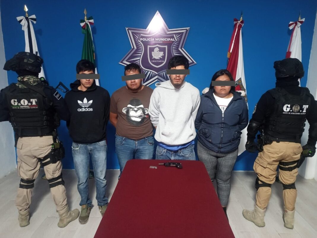 Elementos adscritos a la Dirección de Seguridad Pública Municipal y Vialidad de Chiautempan, lograron asegurar a tres hombres y una mujer, luego de localizar en un vehículo de su pertenencia un arma de fuego, con la cual se presume habrían consumado diversos robos en la comunidad de San Bartolomé Cuahuixmatlac.