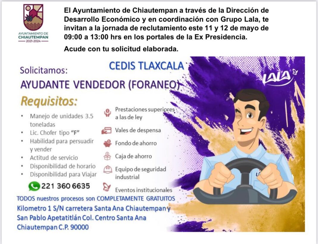 El Ayuntamiento de Chiautempan, a través de la Dirección de Desarrollo Económico, invita a la población a formar parte de la jornada de reclutamiento del Grupo Lala, para ayudante vendedor foráneo.