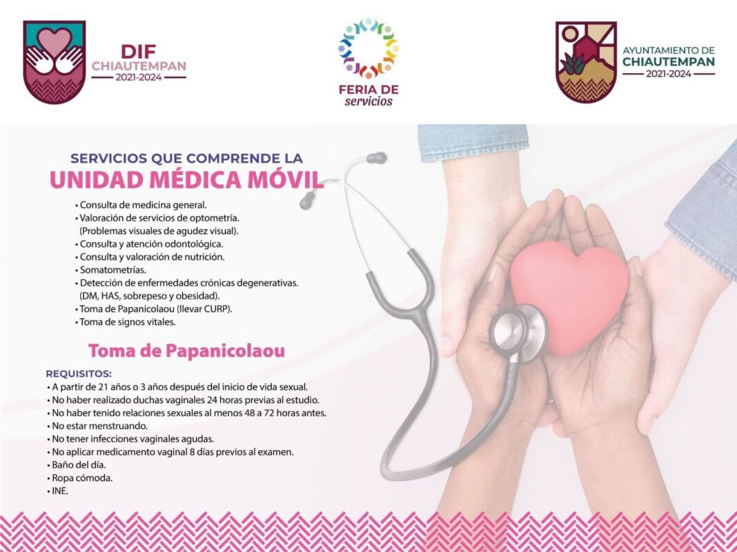 La Feria se instalará en la presidencia de Ixcotla en un horario de 10:00 a 14:00 horas, y traerá consigo a la Unidad Médica Móvil que ofrecerá consulta de medicina general, además de valoración de servicios de optometría, odontología, nutrición, somatometrías, detección de enfermedades crónico degenerativas, y la toma de Papanicolaou.