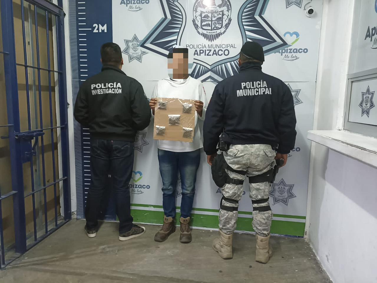 Los trabajos de investigación y patrullajes del Grupo Especial de Operaciones de la Dirección de Seguridad Pública Municipal, Vialidad y Transporte de Apizaco, permitió a elementos de la corporación concretar la detención de dos sujetos por su probable participación en delitos contra la salud y faltas administrativas.