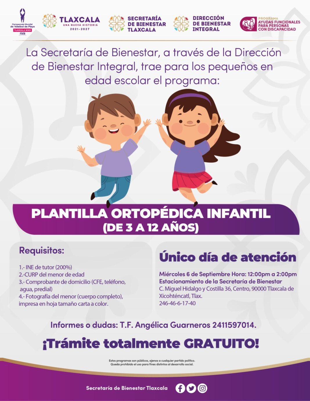 Para prevenir, disminuir y erradicar la incidencia de defecto postural, pie plano, pie cavo y fascitis plantar entre la comunidad escolar, la Secretaría de Bienestar desarrolla el programa “Plantilla Ortopédica Infantil”, que entrega gratuitamente estos insumos a niñas y niños tlaxcaltecas de 3 a 12 años de edad.