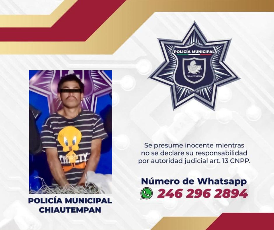 Por este hecho, los elementos adscritos a la Policía Municipal de Chiautempan procedieron a la legal detención del sujeto para su traslado a la Comisaría.
