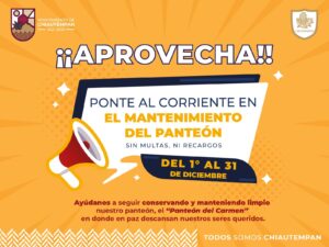 Por último, con el fin de seguir conservando y mantener limpio las instalaciones del “Panteón del Carmen”, la Tesorería Municipal invita a la ciudadanía a estar al corriente en el pago del mantenimiento con un “Sólo Pago” y con ello evitar multas y recargos.