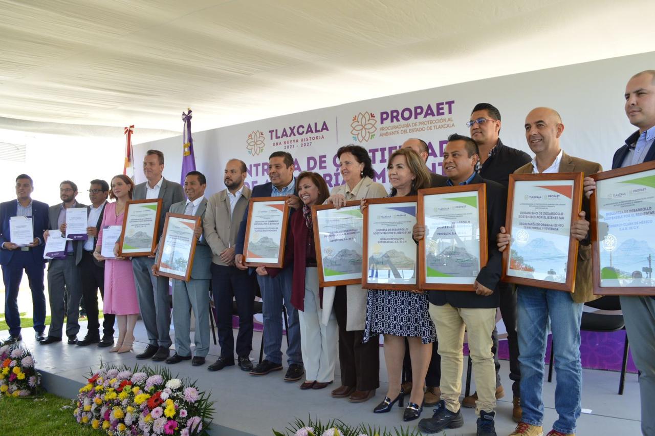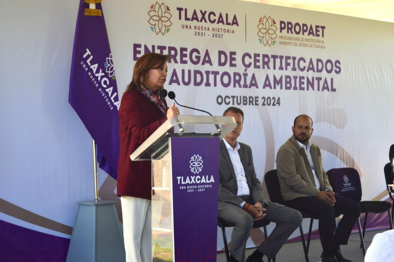 Tetla, Tlax. 10 de octubre de 2024. Esta tarde en las instalaciones de la planta DBW en ciudad industrial Xicohténcatl, la Gobernadora del Estado, Lorena Cuéllar Cisneros realizó la entrega de certificados de auditoría ambiental, con el fin de resaltar el compromiso junto con dependencias de gobierno e instituciones educativas con el cuidado y protección del medio ambiente, promoviendo buenas prácticas que permiten el desarrollo económico pero también ecológico de la región, dando el liderazgo y responsabilidad a las mismas para generar espacios ambientales.