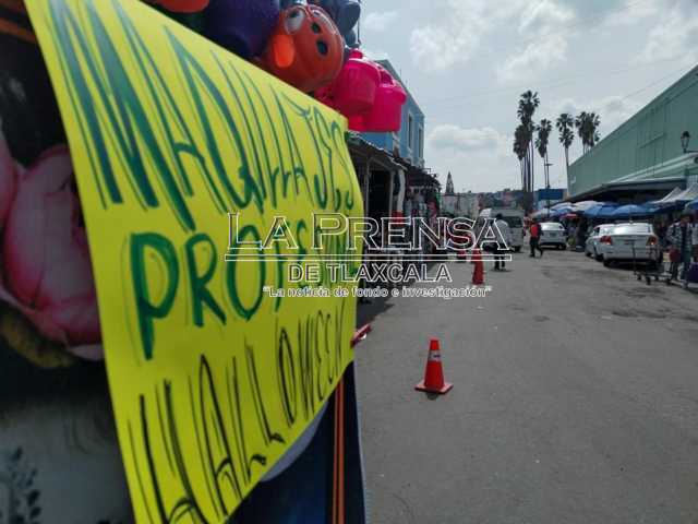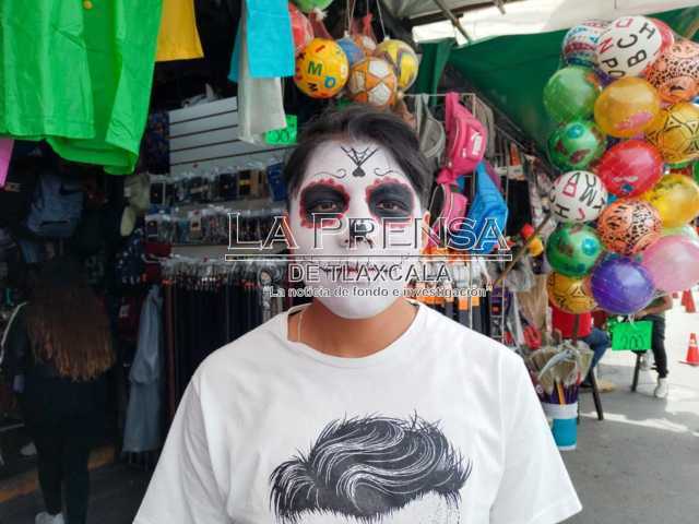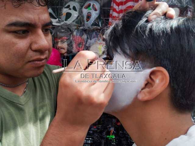 Tlaxcala, Tlax, 27 de octubre de 2024. En las inmediaciones del mercado “Emilio Sánchez Piedras”, de Tlaxcala se encuentran lo primos, Mario y Daniel López, quiénes son maquillistas profesionales desde hace nueve años, y que han colocado su negocio para brindar sus servicios de maquillaje de calaveras, de látex y el diseño que la gente quiera. Los precios van desde los 100 pesos en adelante, dependiendo el modelo y estarán hasta el 1 de noviembre.