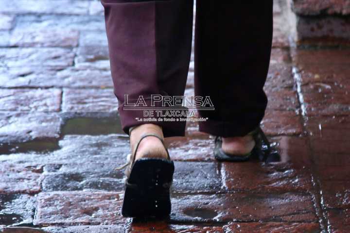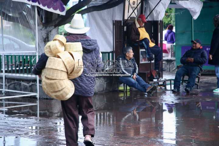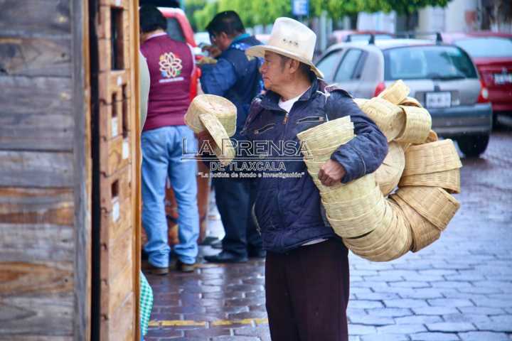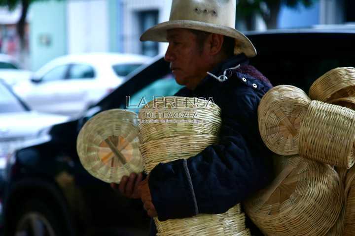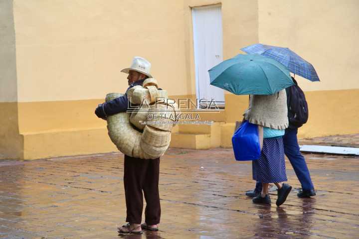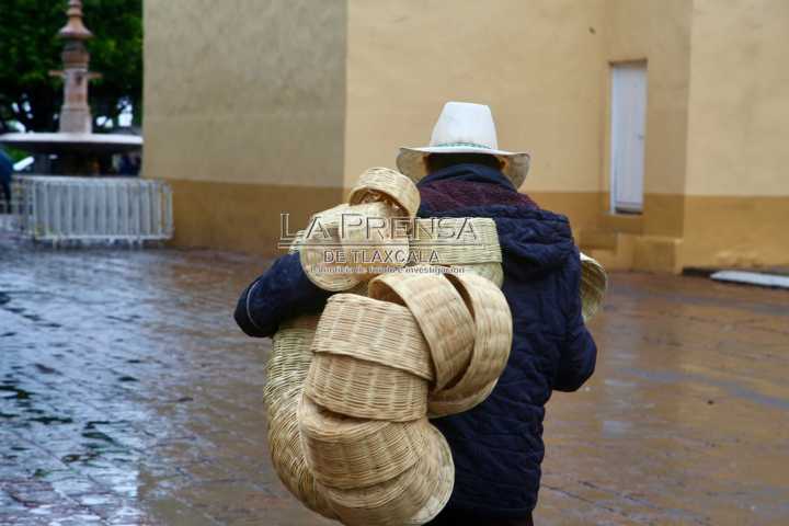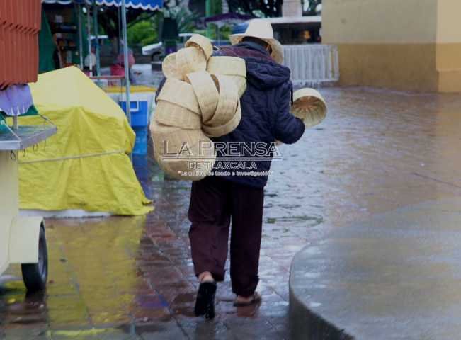 Tlaxcala, Tlax. Un vendedor de cestos de mimbre, camina por las calles de la capital tlaxcalteca para ofrecer sus productos a los transeúntes sin importar las inclemencias del tiempo. El artesano originario de Zacapoaxtla, Puebla, camina bajo la lluvia con su vestimenta habitual de huaraches y sombrero, con el objetivo de lograr sus ventas.