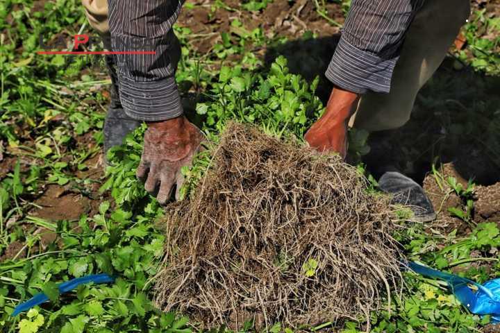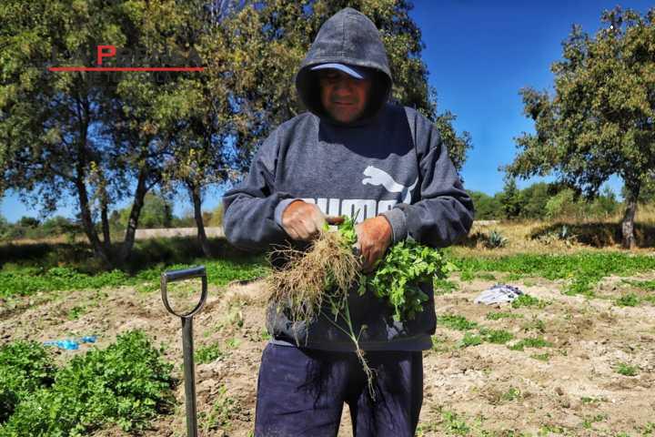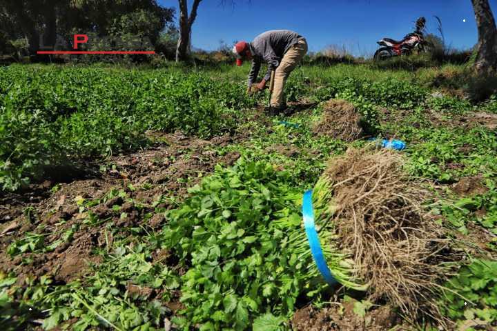 En terrenos de San Lorenzo Axocomanitla, don Margarito, juntos a sus compañeros cosechan cilantro, mismo que comercializan en la central de abastos de Puebla a un costo de entre 40 y 50 pesos el manojo.