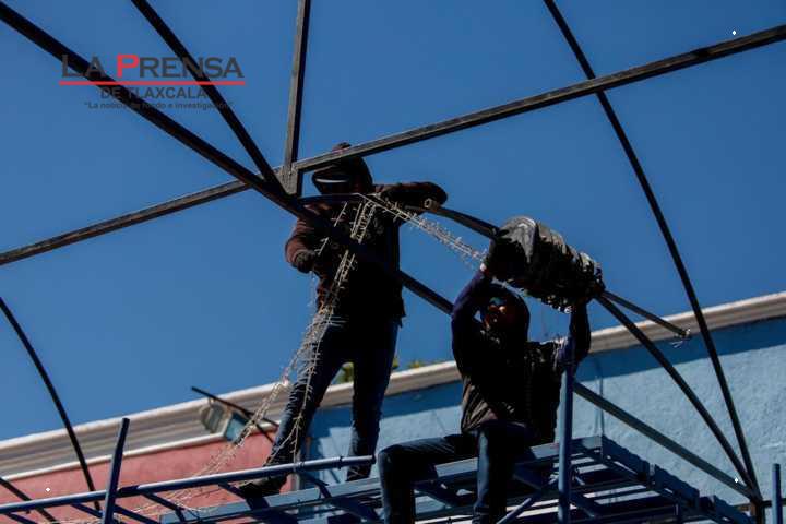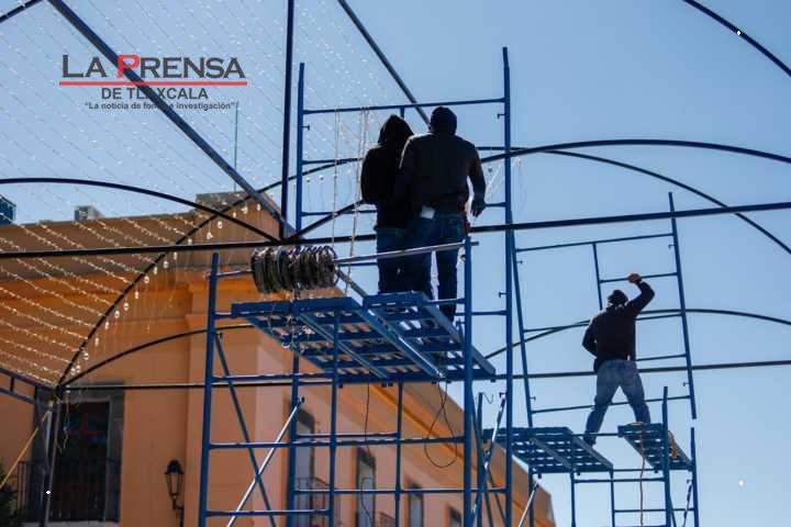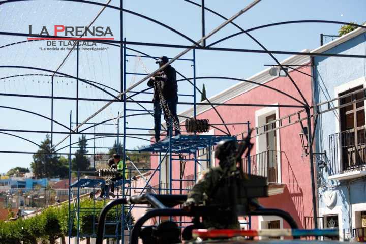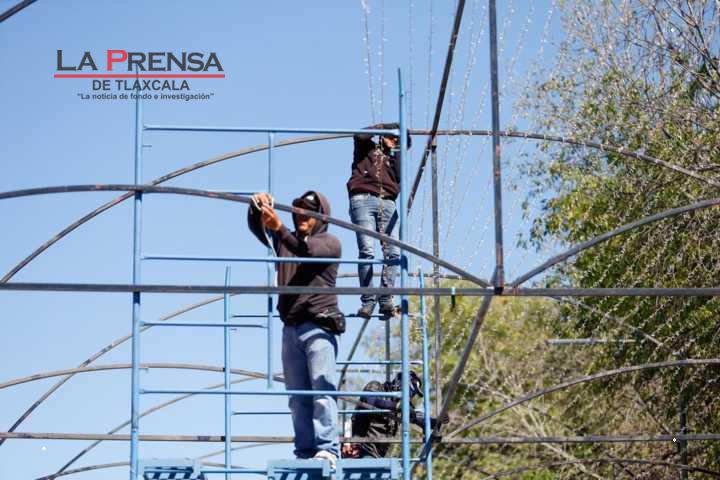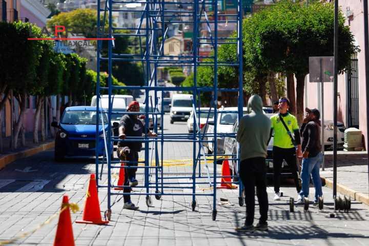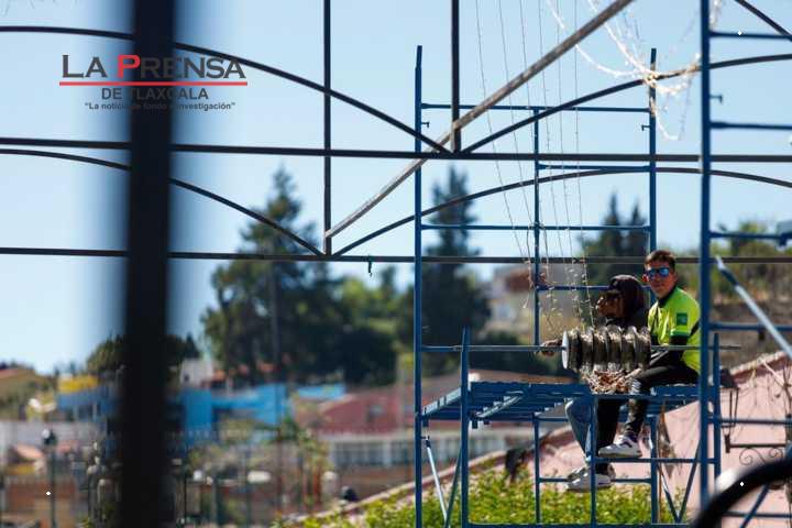 Tlaxcala, Tlax. 28 de noviembre de 2024. Como cada año en la avenida Independencia de Tlaxcala, comienza el armado del arco de luces con motivo de la temporada navideña, por lo que mientras dure dicha instalación la circulación se reduce a un carril, por lo que se exhorta a manejar con precaución en la zona.