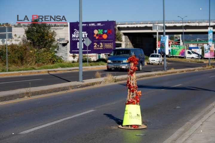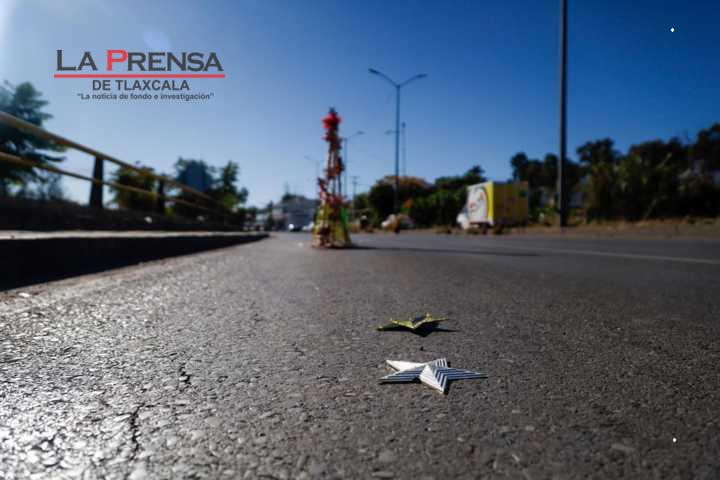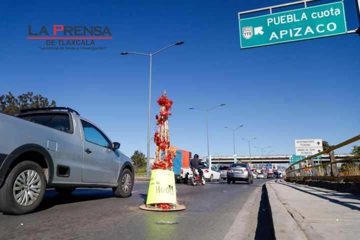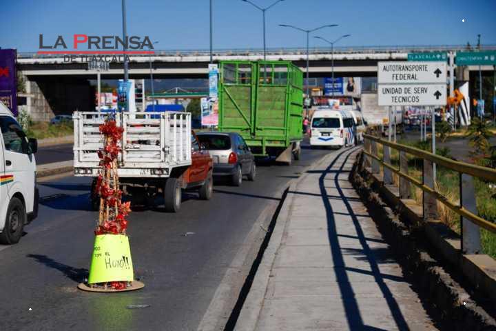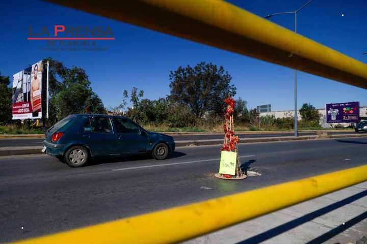 Acuitlapilco, Tlax. 29 de noviembre de 2024. Luego de varios días en que una coladera permaneciera sin tapa sobre la carretera federal Tlaxcala-Puebla a la altura de Acuitlapilco, vecinos decidieron poner un pino navideño con un cartel para alertar a los conductores que hay un hoyo que podría afectar sus unidades móviles.