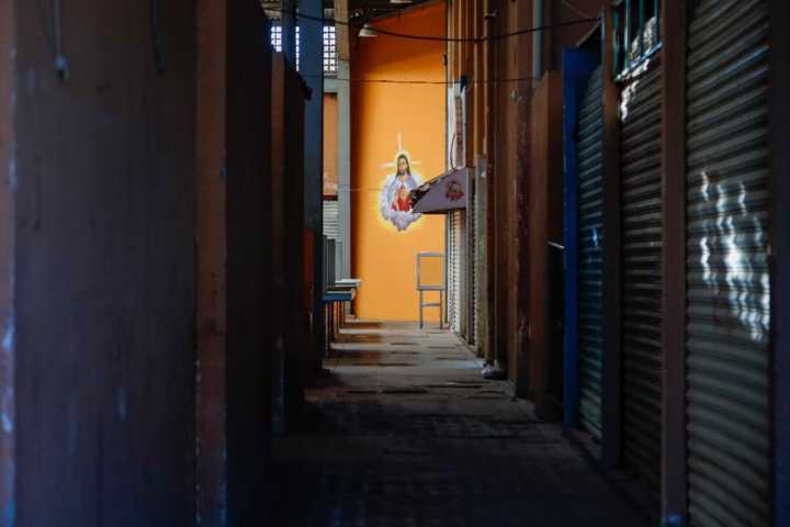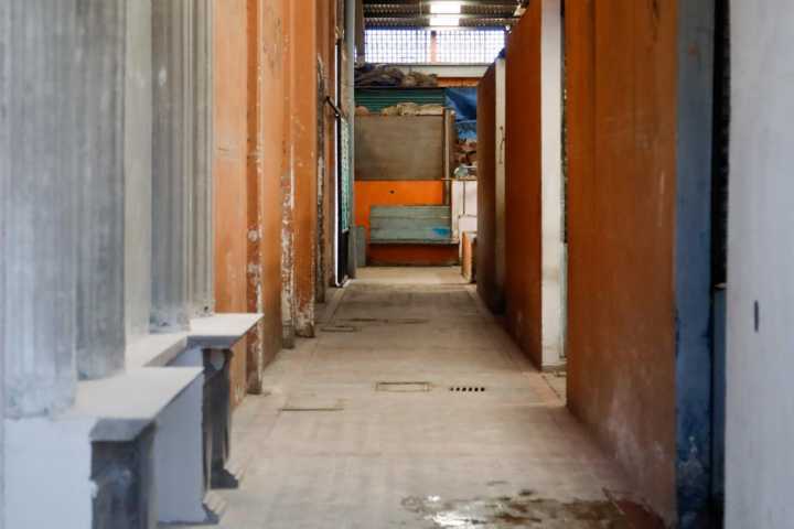 Las paredes y fachadas descuidadas, las cortinas oxidadas y la banqueta dañada con maleza sugieren un ambiente de abandono y desgaste.