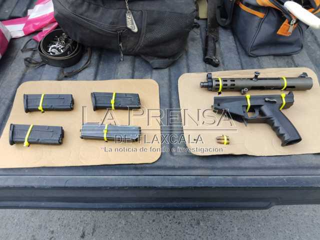 En el lugar, personal de la Guardia Nacional (GN), detuvo a Juan N., de 56 años, con domicilio en la Colonia Manantiales, además de Sergio N., de 48 años de edad, con domicilio en la colonia Carrillo Puerto, ambos de ocupación herrero y originarios de San Martín Texmelucan, Puebla, así como a Gabino N., de 61 años vecino de Guadalupe Victoria, Nativitas, Tlaxcala de ocupación comerciante, a quienes les localizaron un arma hechiza, aparentemente de calibre .9mm, así como 4 cargadores, sin especificar si se encontraban abastecidos.
