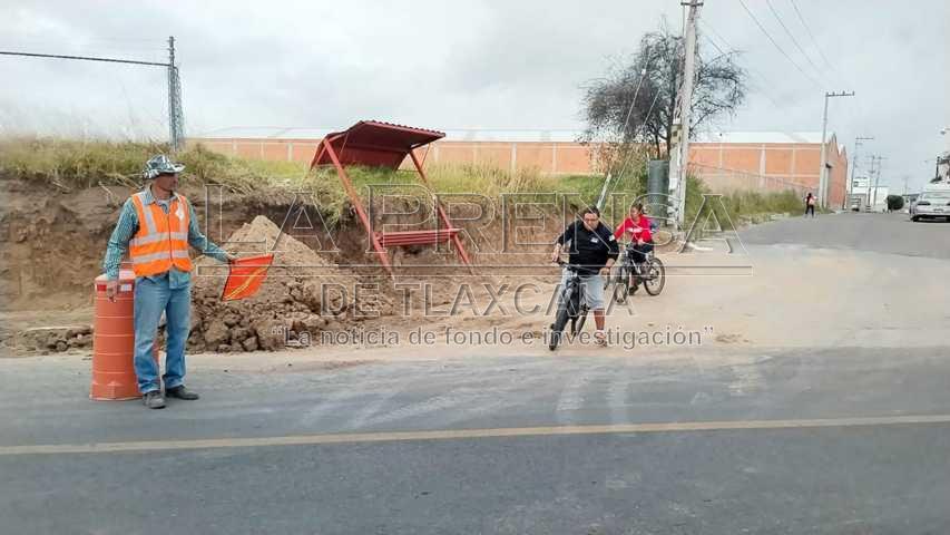 Apetatitlán, Tlax, 20 de noviembre de 2024. Sobre la carretera Camino Real a San Pablo Apetatitlán, el paso de los automóviles y transporte público es limitado derivado a que trabajadores comenzaron hace dos semanas a construir banquetas y guarniciones en la zona, por lo que se recomienda tomar precauciones. Estos trabajos se prevén concluya en un mes.