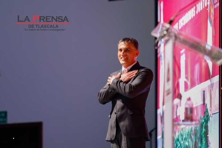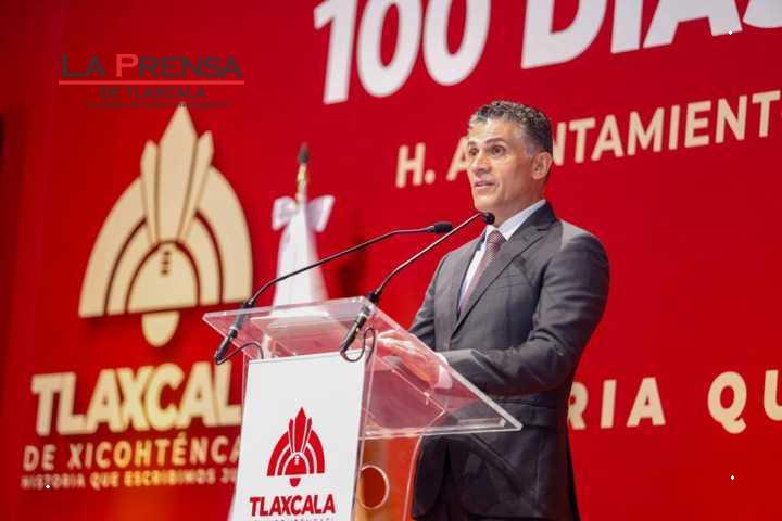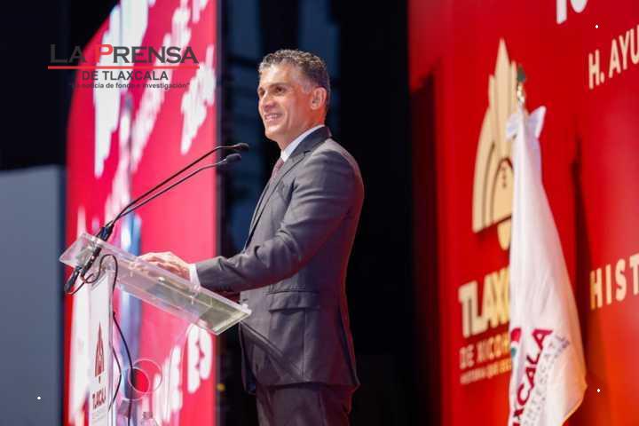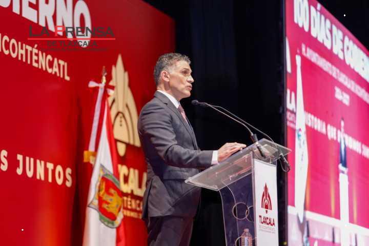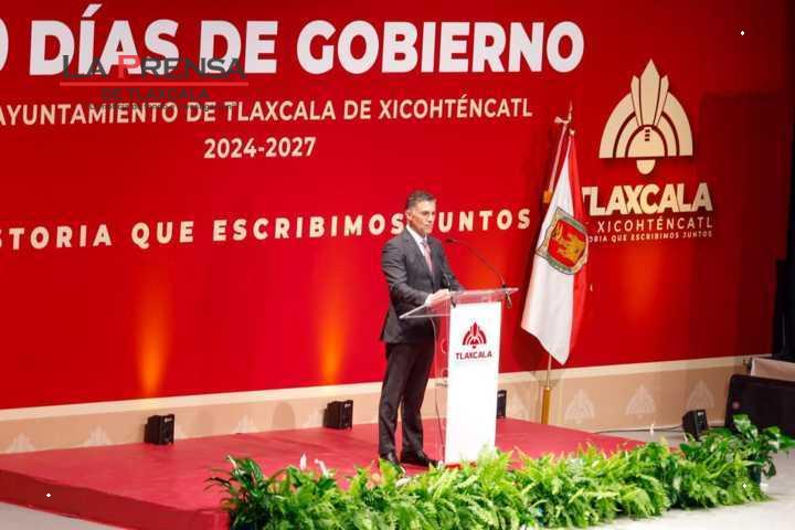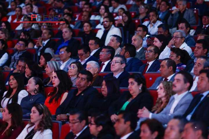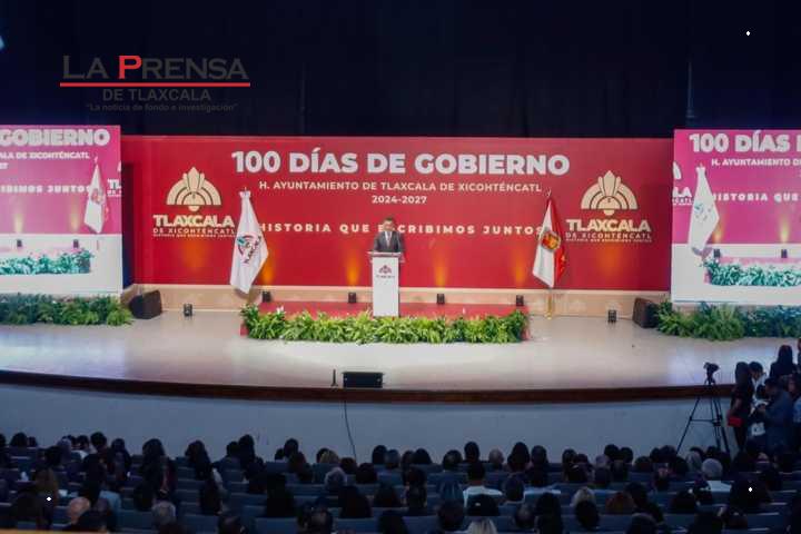 Tlaxcala, Tlax. 30 de noviembre de 2024. El alcalde capitalino, Alfonso Sánchez García, acompañado de la gobernada Lorena Cuéllar, como invitada de honor, rindió este día en el complejo cultural universitario su informe por 100 días de gobierno.