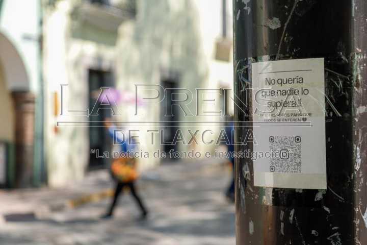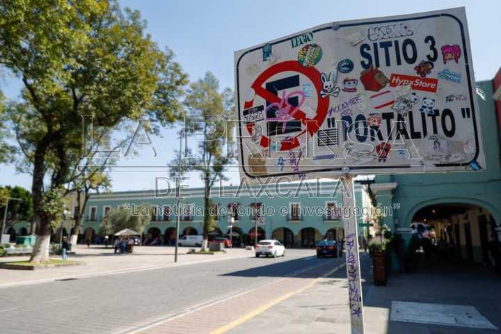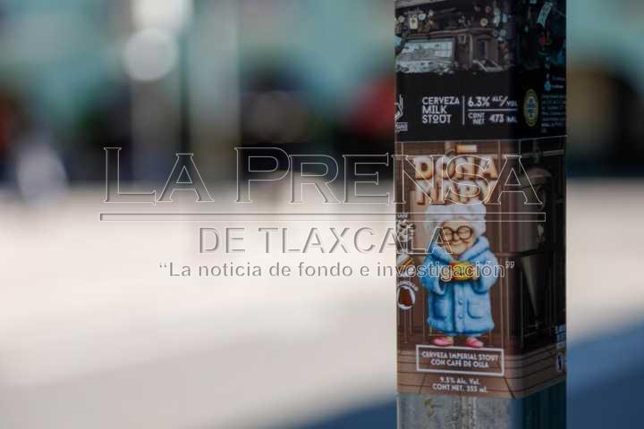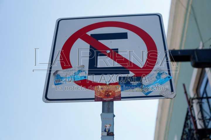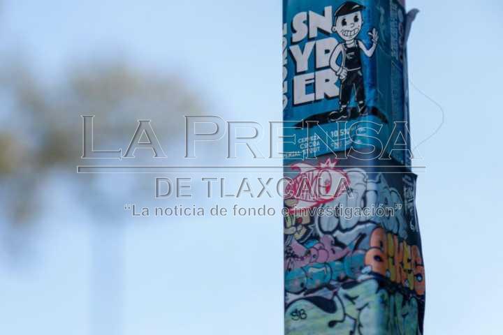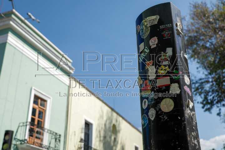 Tlaxcala, Tlax. 18 de noviembre de 2024. Sobre el primer cuadro de la capital tlaxcalteca, es común poder ver stickers pegados en señalamientos, semáforos y tomas de luz, los cuales hacen referencia a algún producto, servicio o marca personal.
