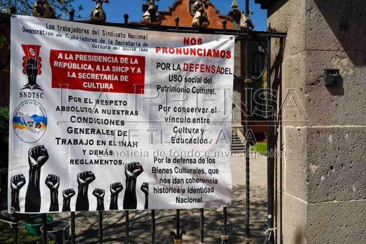 Tlaxcala, Tlax. 13 de noviembre de 2024. Trabajadores sindicalizados pertenecientes al Instituto Nacional de Antropología e Historia (INAH), han colocado lonas a las afueras del Palacio de Cultura en Tlaxcala para demandar la salida del director nacional, Diego Prieto, por la defensa del uso social del patrimonio cultural y respeto a sus derechos laborales.
