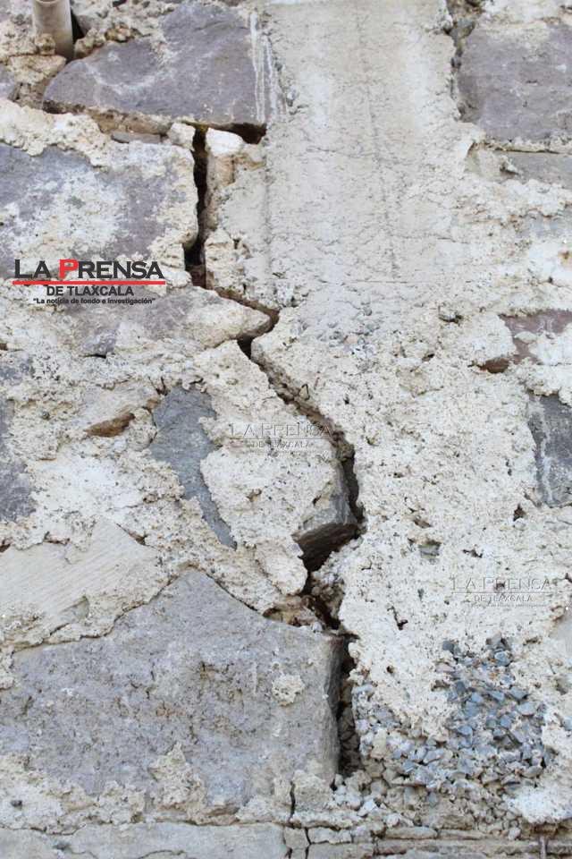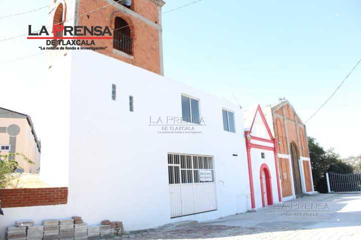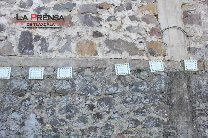 Tlaxcala, Tlax. 39 diciembre 2024. El muro de mampostería de la capilla de la comunidad de San Buena Aventura Atempan, presenta varias fracturas en sus paredes que limitan con las calles Margarita Maza de Juárez y Prolongación Ruiz Cortines, por lo que representa un riesgo para los vecinos, mismos que han optado por colocar unos carteles indicando la alerta de peligro para no pasar por la zona dañada.