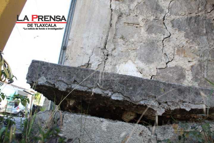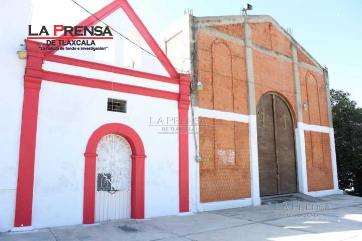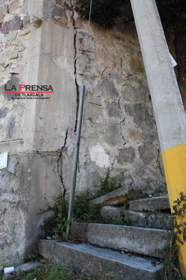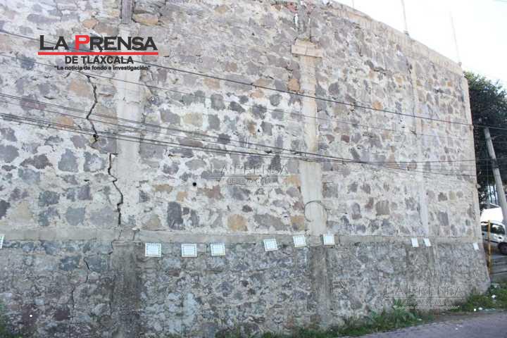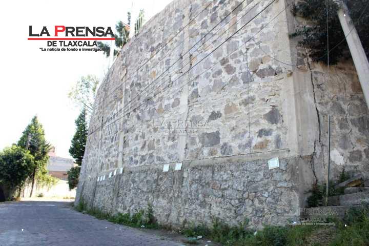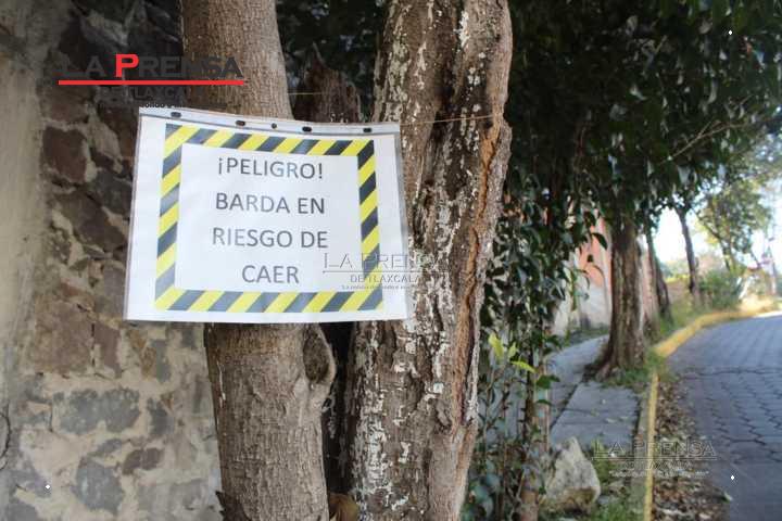 Tlaxcala, Tlax. 39 diciembre 2024. El muro de mampostería de la capilla de la comunidad de San Buena Aventura Atempan, presenta varias fracturas en sus paredes que limitan con las calles Margarita Maza de Juárez y Prolongación Ruiz Cortines, por lo que representa un riesgo para los vecinos, mismos que han optado por colocar unos carteles indicando la alerta de peligro para no pasar por la zona dañada.
