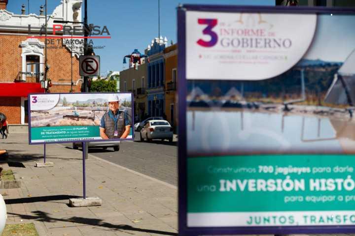 Tlaxcala, Tlax. 02 de diciembre de 2024. Como parte de la estrategia de comunicación para dar a conocer las acciones realizadas, previo al tercer informe de la mandataria Lorena Cuéllar, en la Plaza de la Constitución se han colocado diversos carteles con los logros de la administración estos tres años, para que la ciudadanía pueda constatar el trabajo del ejecutivo estatal.