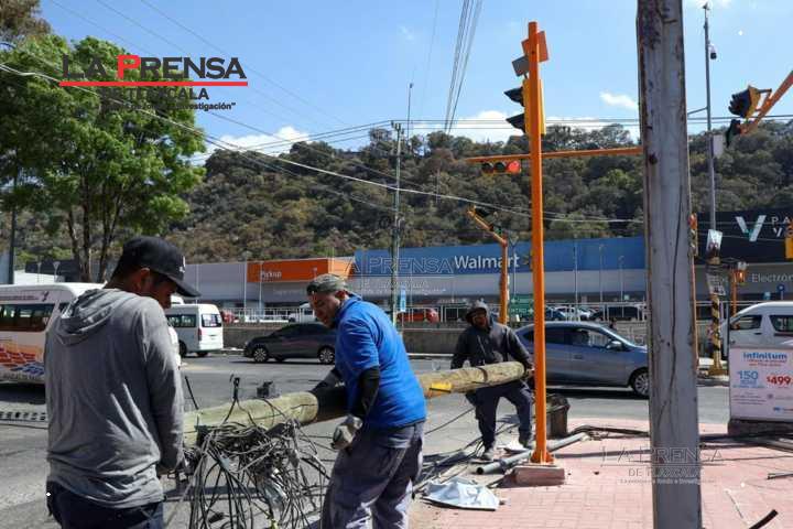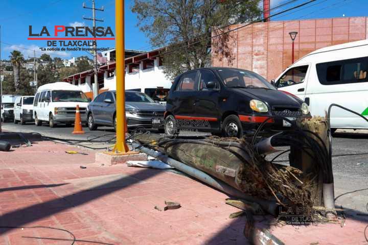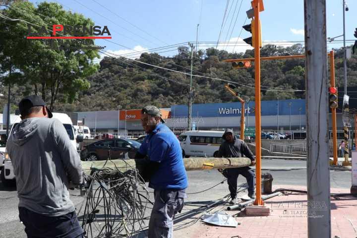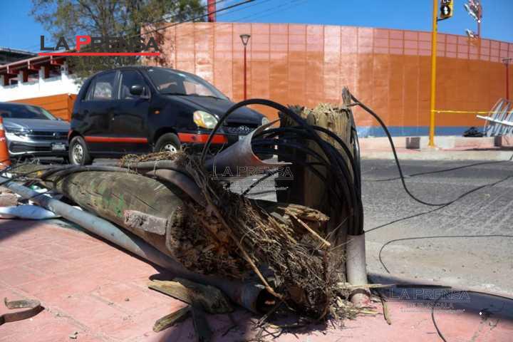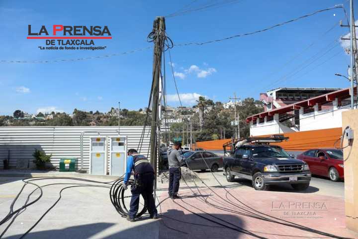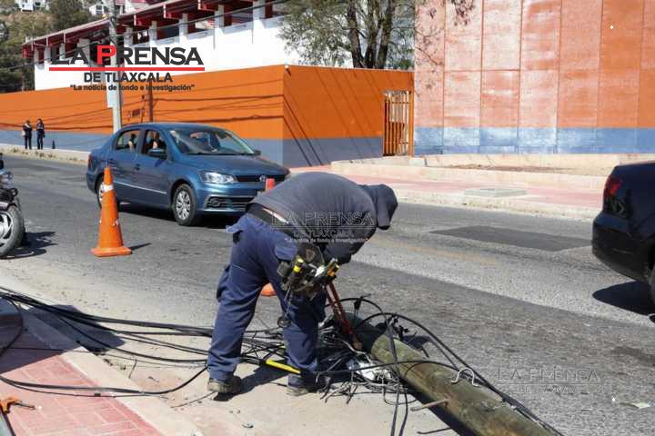 Tlaxcala, Tlax, 30 de enero de 2025.- Esta tarde sobre la calle Guillermo Valle de la capital tlaxcalteca, un poste de telecomunicaciones se cayó dejando sin servicios a la zona, por lo que trabajadores de las compañías telefónicas ya trabajan para retirar los cables y postes. Debido a este hecho, la circulación se ve afectada, momentáneamente en lo que realizan trabajos de remoción.