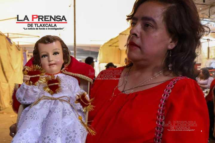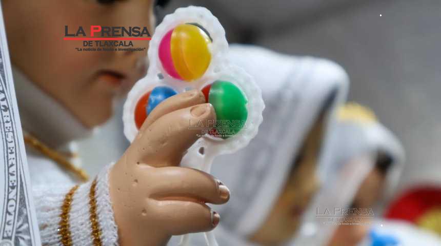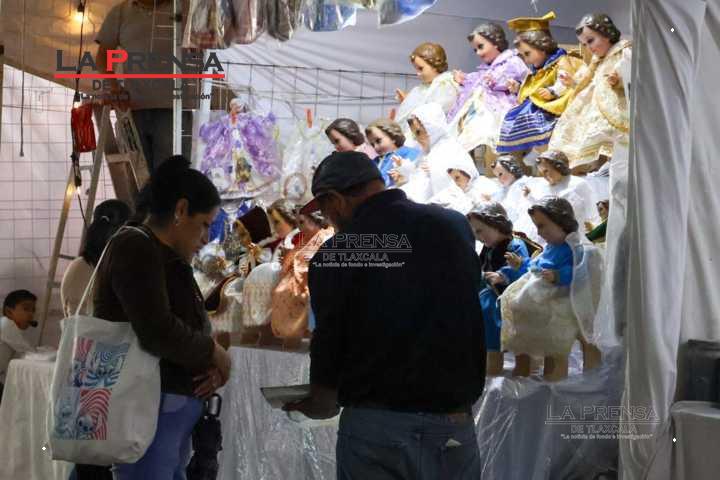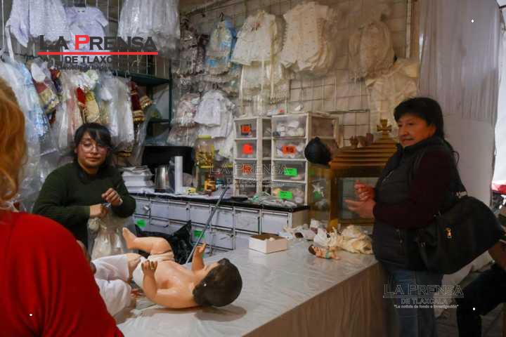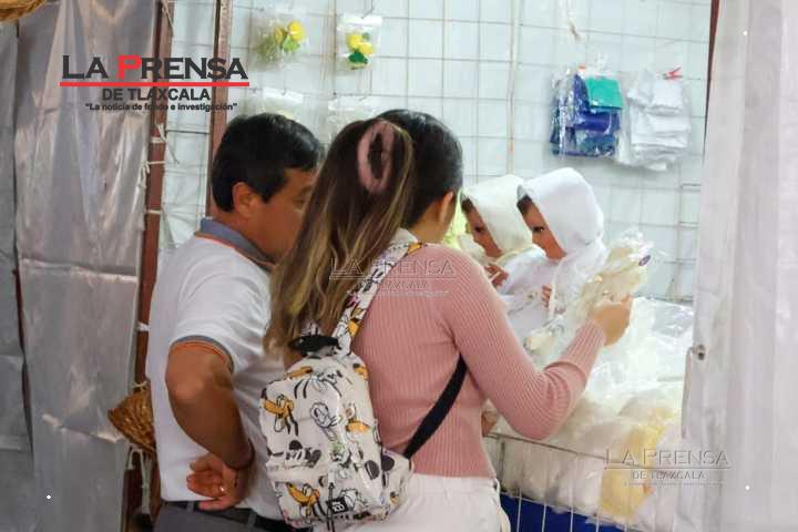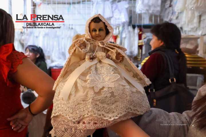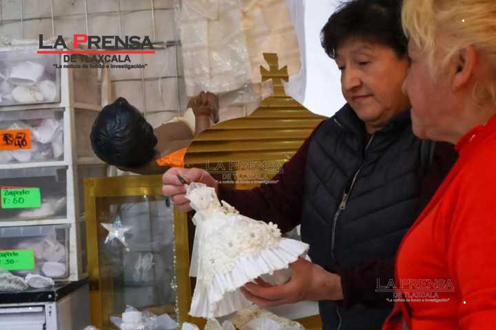 Chiautempan, Tlax, 19 de enero de 2025. Los vendedores de ropones para Niños Dios en Chiautempan, comienzan a exhibir y vender sus productos de cara al Día de la Candelaria el próximo 2 de febrero.