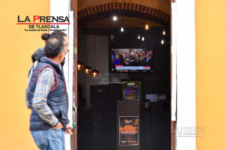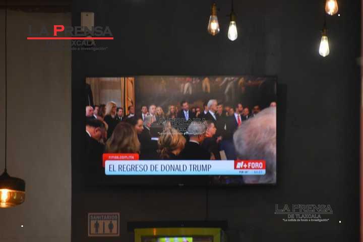 Tlaxcala, Tlax., 20 de enero 2025. La ciudadanía tlaxcalteca también se ha sumado a la transmisión de la toma de protesta de Donald Trump, pues diferentes comercios y restaurantes de la entidad han sintonizado el regreso del político neoyorquino a la presidencia de Estados Unidos a través de cadenas nacionales e internacionales.