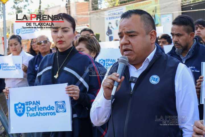 Tlaxcala, Tlax, 27 de enero de 2025. A las afueras de las oficinas regionales de Infonavit de Tlaxcala, simpatizantes del Partido Acción Nacional (PAN), levantaron la voz en contra de la Ley Infonavit , pues aseguran que dicha reforma prevé que el gobierno federal haga un posible mal uso de los recursos del Instituto de Vivienda.