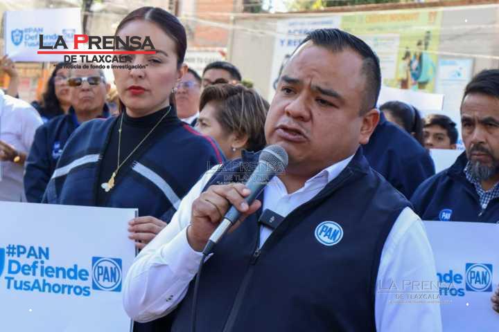 Tlaxcala, Tlax, 27 de enero de 2025. A las afueras de las oficinas regionales de Infonavit de Tlaxcala, simpatizantes del Partido Acción Nacional (PAN), levantaron la voz en contra de la Ley Infonavit , pues aseguran que dicha reforma prevé que el gobierno federal haga un posible mal uso de los recursos del Instituto de Vivienda.