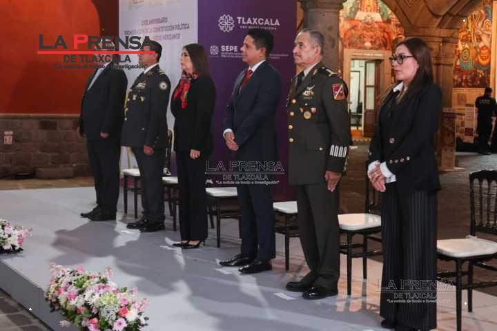 Autoridades de los tres poderes de gobierno en Tlaxcala encabezaron el acto cívico conmemorativo al 108 aniversario de la promulgación de la Constitución Política de los Estados Unidos Mexicanos.