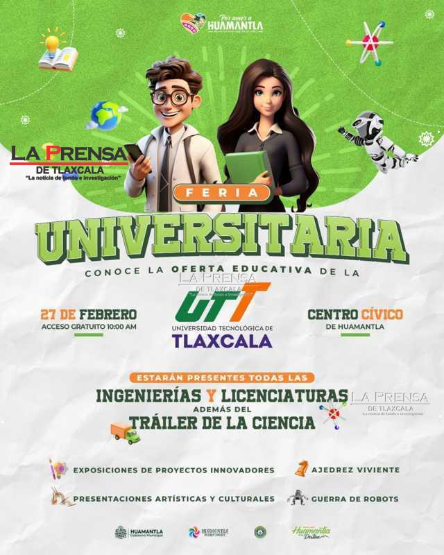 El Gobierno de Huamantla extiende una cordial invitación a toda la juventud del municipio y sus alrededores para asistir a la feria organizada por la Universidad Tecnológica de Tlaxcala (UTT), la cual se llevará a cabo el próximo jueves 27 de febrero de 2025, a partir de la 10:00 horas, en el Centro Cívico de Huamantla.