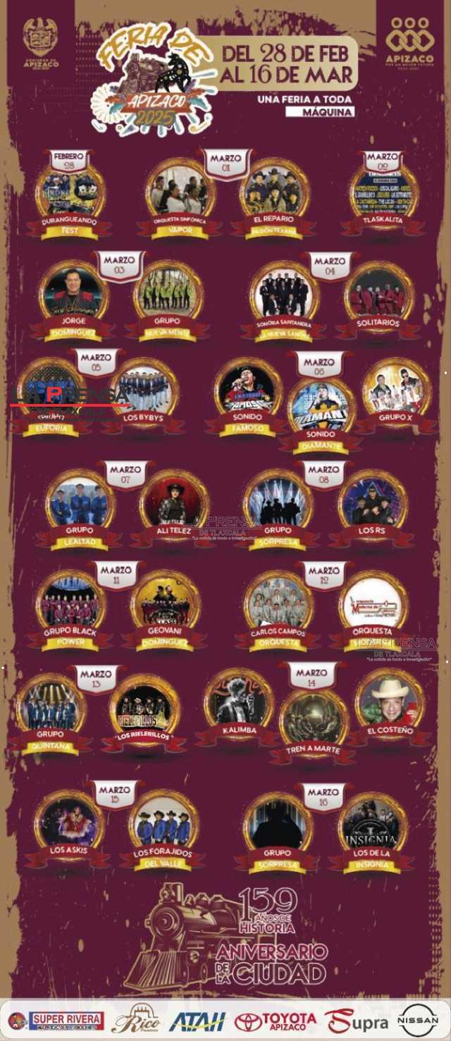 El alcalde municipal de Apizaco, Javier Rivera Bonilla presentó el programa de la Feria Apizaco 2025 que se llevará a cabo del 28 de febrero al 16 de marzo, un evento que refleja la grandeza, tradición y alegría de nuestro municipio, el cual incluye grandes sorpresas, espectáculos de primer nivel, actividades para todas las edades, eventos deportivos y culturales, así como exposiciones artesanales, ganaderas, y las tradicionales paellas en las que presentarán: Kalimba, Tren a Marte y El Costeño.