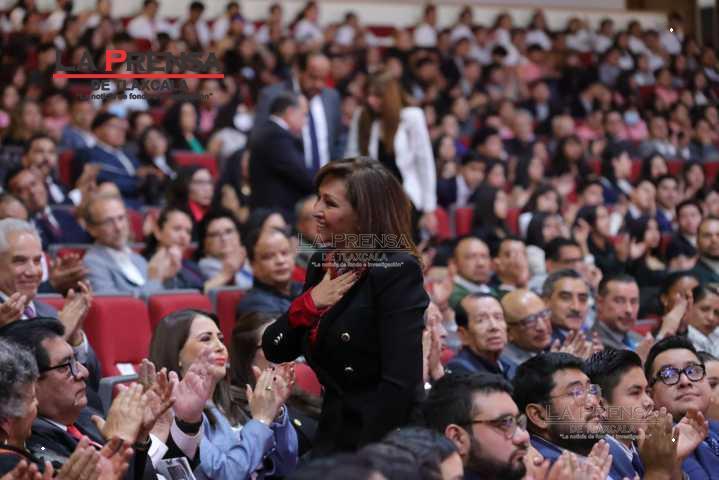 La gobernadora Lorena Cuéllar Cisneros asistió al tercer informe de actividades 2024-2025 del rector de la Universidad Autónoma de Tlaxcala (UATx), Serafín Ortiz Ortiz.