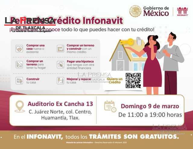 El Gobierno Municipal de Huamantla y el Instituto del Fondo Nacional de la Vivienda para los Trabajadores (Infonavit) invitan a las y los derechohabientes a participar en la próxima Feria de Crédito, donde podrán conocer y acceder a diversas opciones de financiamiento para mejorar o adquirir una vivienda.
