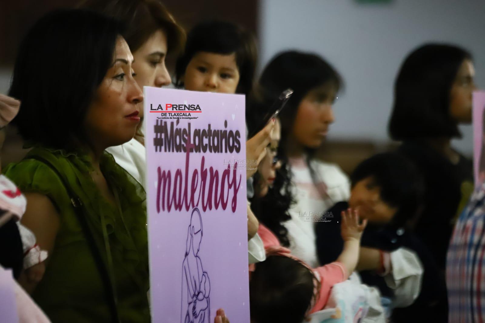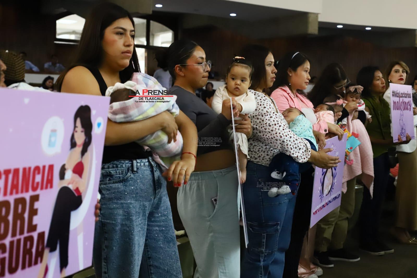 Madres junto con sus bebés en brazos se manifestaron en el pleno del Congreso del Estado de Tlaxcala para expresar su apoyo a la iniciativa de la diputada Miriam Martínez, que busca implementar lactarios en dependencias gubernamentales y lugares laborales.