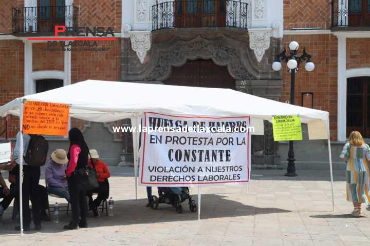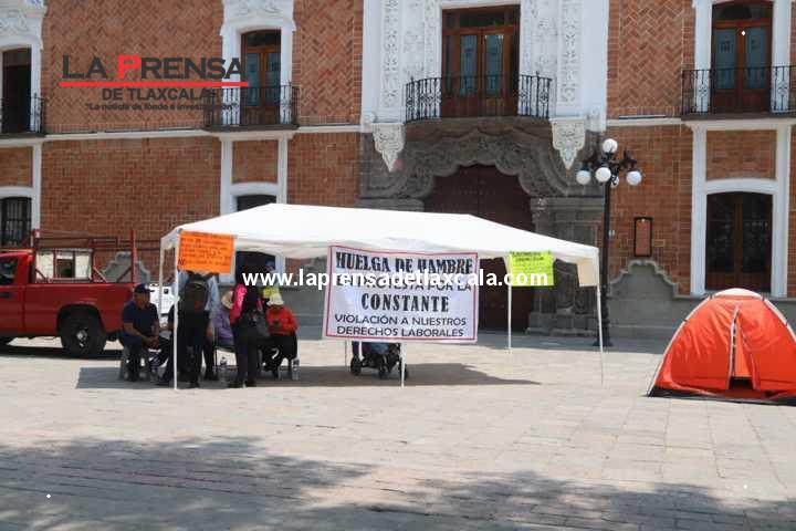 Luego de manifestarse sin éxito a las afueras del Congreso del Estado, trabajadores y extrabajadores del Instituto Tecnológico de Tlaxco se instalaron esta mañana frente a Palacio de Gobierno para iniciar una huelga de hambre.