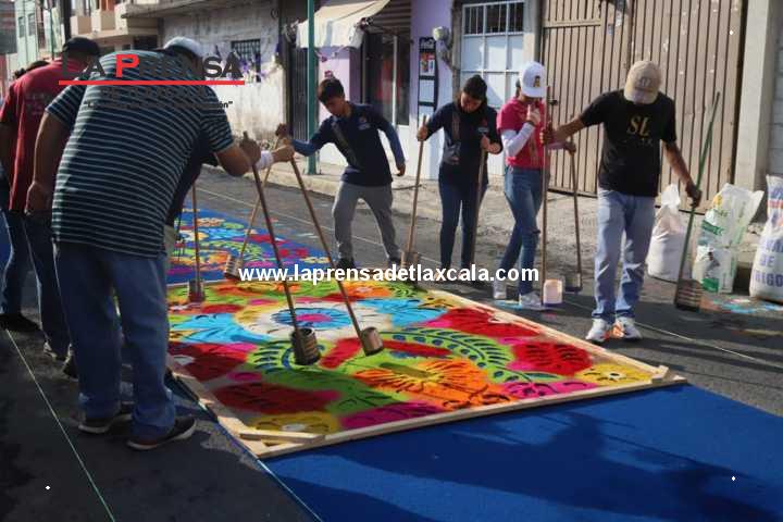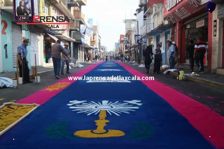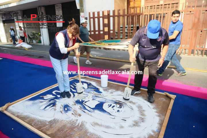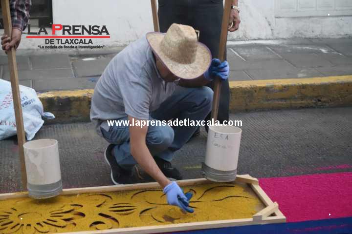 Esta tarde, las principales calles de la ciudad de Chiautempan se visten de color y devoción, mientras vecinos se reúnen para realizar las tradicionales alfombras de aserrín, en preparación para la solemne Procesión de padre jesús del convento y la virgen dolorosa