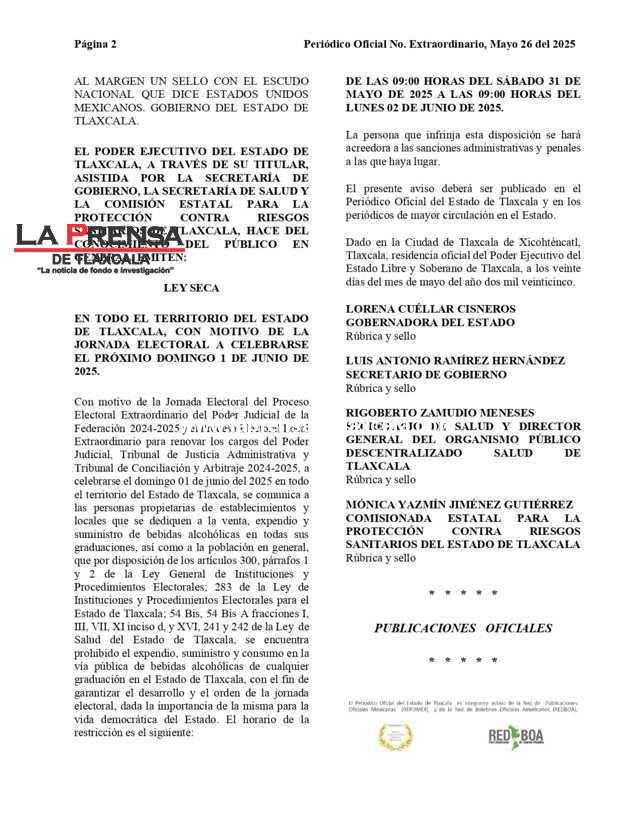 El documento, publicado este 26 de mayo en el Periódico Oficial del Estado de Tlaxcala, está avalado por la gobernadora Lorena Cuellar Cisneros, y los titulares de las secretarías de Gobierno (Segob) y Salud (Sesa), así como la Comisionada Estatal para la Protección contra Riesgos Sanitarios del Estado.