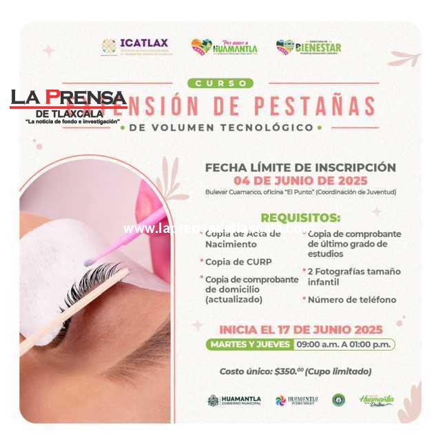 Como una forma de generar oportunidades de autoempleo para la ciudadanía, el Gobierno Municipal de Huamantla, que encabeza Salvador Santos Cedillo, en coordinación con el Instituto de Capacitación para el Trabajo del Estado de Tlaxcala (ICATLAX), invita a la población interesada a participar en el curso “Extensión de Pestañas de Volumen Tecnológico”, el cual iniciará el próximo 17 de junio.