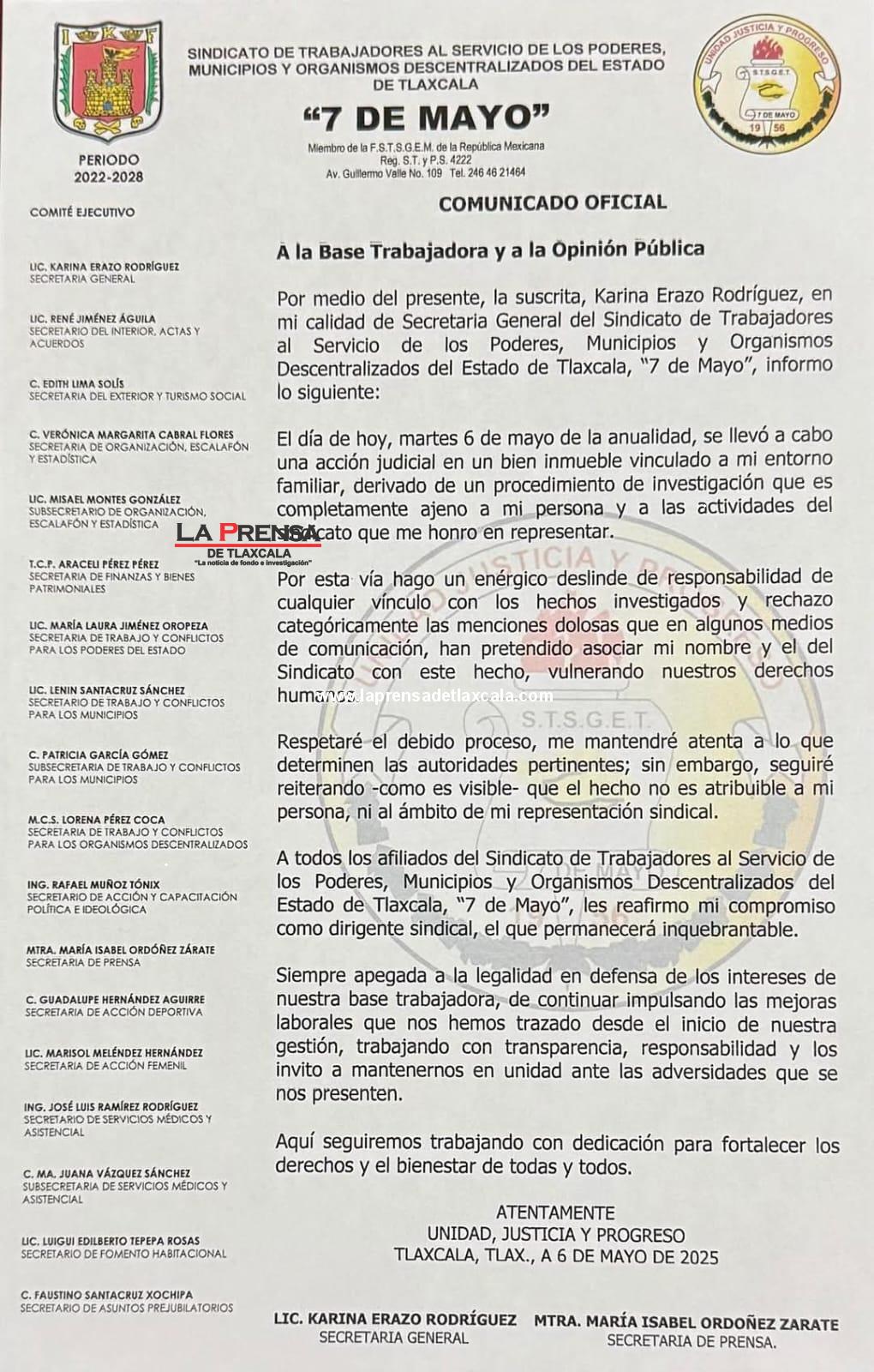 Ante el comunicado difundido por Karina Erazo Rodríguez, Secretaria General del Sindicato de Trabajadores al Servicio de los Poderes, Municipios y Organismos Descentralizados del Estado de Tlaxcala “7 de Mayo”, en el que se deslinda de una acción judicial vinculada a su entorno familiar, es pertinente hacer algunas precisiones en defensa del ejercicio periodístico y del derecho a la información.