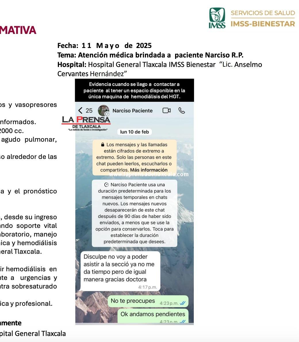 El paciente Narciso N., diagnosticado con Enfermedad Renal Crónica (ERC) desde hace dos años, falleció este 10 de mayo en el Hospital General de Tlaxcala IMSS-Bienestar “Lic. Anselmo Cervantes Hernández”, donde recibía atención médica. Autoridades del sector salud informaron que el paciente recibió atención médica oportuna y especializada durante más de ocho horas, desde su ingreso hasta su deceso.