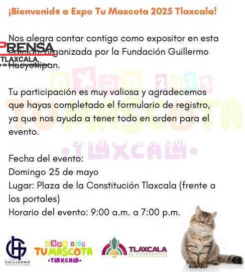 El Ayuntamiento de Tlaxcala, en colaboración con la Fundación Guillermo Hueyotlipan, invita a la ciudadanía a participar en la Expo Tu Mascota 2025, un evento que promueve el respeto, cuidado y bienestar de los animales de compañía, a realizarse este domingo 25 de mayo en la Plaza de la Constitución de la capital, de 9:00 a.m. a 7:00 p.m.
